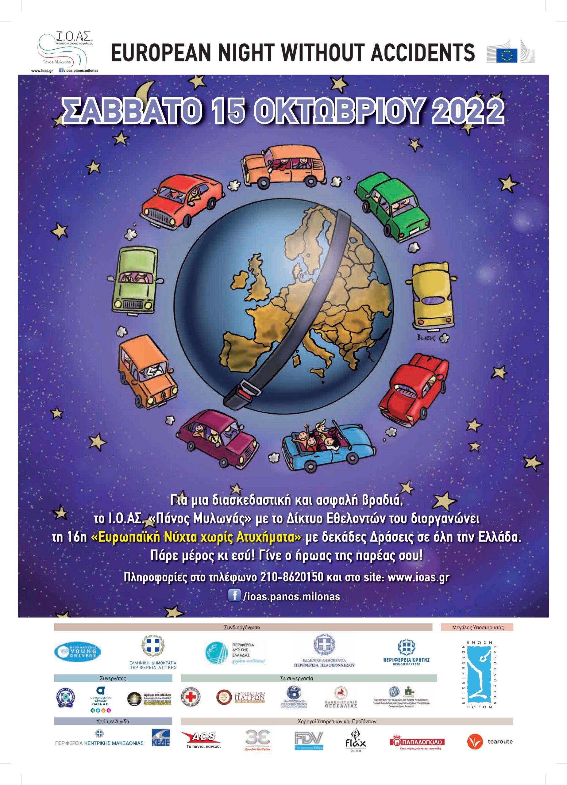 Το Ινστιτούτο Οδικής Ασφάλειας (Ι.Ο.Α.Σ) “Πάνος Μυλωνάς” συνεχίζει για μια ακόμη χρονιά τις δράσεις ευαισθητοποίησης των πολιτών σε θέματα τροχαίων ατυχημάτων. Έτσι και φέτος, το Σάββατο 15 Οκτωβρίου, διοργανώνει τη 16η “Ευρωπαϊκή Νύχτα χωρίς Ατυχήματα”, ταυτόχρονα, σε 40 πόλεις, σε 40 νυχτερινά σημεία διασκέδασης σε όλη την Ελλάδα, προωθώντας το μήνυμα ότι “το αλκοόλ και η οδήγηση δεν πάνε μαζί”.