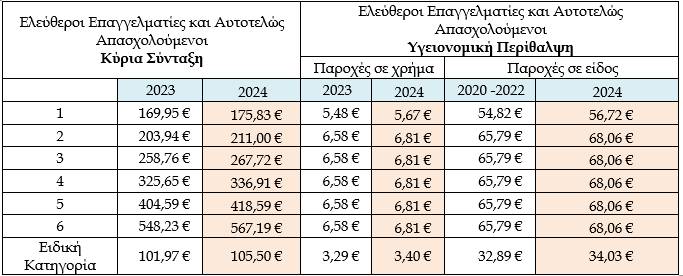 Υπενθυμίζεται πως σύμφωνα με τον ισχύοντα νόμο οι εισφορές των ασφαλιστικών κλάσεων των ελευθέρων επαγγελματιών και των αυτοαπασχολουμένων προσαυξάνονται κατά το ποσοστό μεταβολής του μέσου πληθωρισμού της προηγούμενης χρονιάς, δηλαδή κατά 3,46% για το 2024.