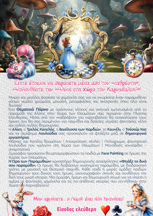 Πίσω όμως από τον «καθρέφτη» του καρναβαλιού, «κρύβονται» δράσεις και εργαστήρια με την Αλίκη, τον Τρελοκαπελά, την Βασίλισσα των Καρδιών, το Κουνέλι, τον Τσέσαϊρ Κατ και τα Λουλούδια με: