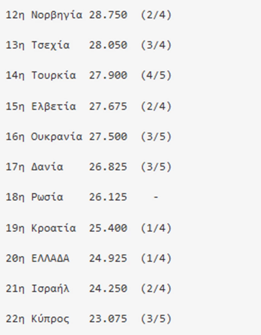 Η βαθμολογία από τις θέσεις 12-22 (σ.σ. σε παρένθεση οι ομάδες που συνεχίζουν στις ευρωπαϊκές διοργανώσεις και όσες άρχισαν):