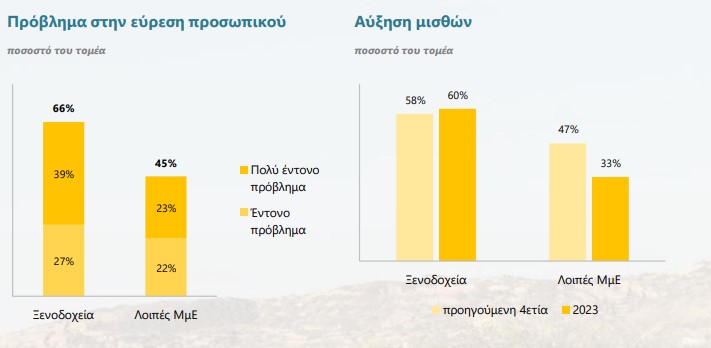 Όπως επισημαίνεται, παρά την αναπτυξιακή διάθεση των ελληνικών ξενοδοχείων, το 2023 διατηρεί στοιχεία υψηλής αβεβαιότητας με βασικό εμπόδιο τη δυσκολία εύρεσης προσωπικού. Καθώς για το 39% αποτελεί «πολύ έντονο πρόβλημα» και για το 27% «έντονο πρόβλημα». Συνολικά δηλαδή το 66% των επιχειρήσεων του κλάδου επισημαίνει το ζήτημα, την ίδια στιγμή που για τις υπόλοiπες μικρομεσαίες επιχειρήσεις το αντίστοιχο ποσοστό φτάνει το 45%.