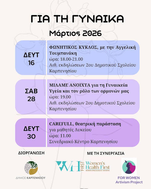 Ο Δήμος Καρπενησίου προσκαλεί όλες και όλους σε τρεις μοναδικές εκδηλώσεις αφιερωμένες στη γυναίκα, την υγεία και τη συλλογική έκφραση.