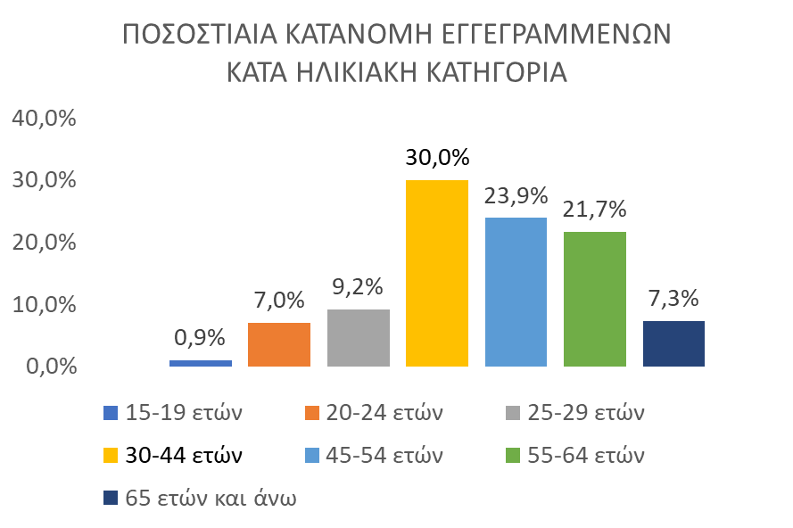 - Η ηλικιακή κατηγορία 30-44 ετών συγκεντρώνει τον μεγαλύτερο αριθμό εγγεγραμμένων μεταξύ των ηλικιακών κατηγοριών ο οποίος ανέρχεται σε 277.142 άτομα (ποσοστό 30,0%).