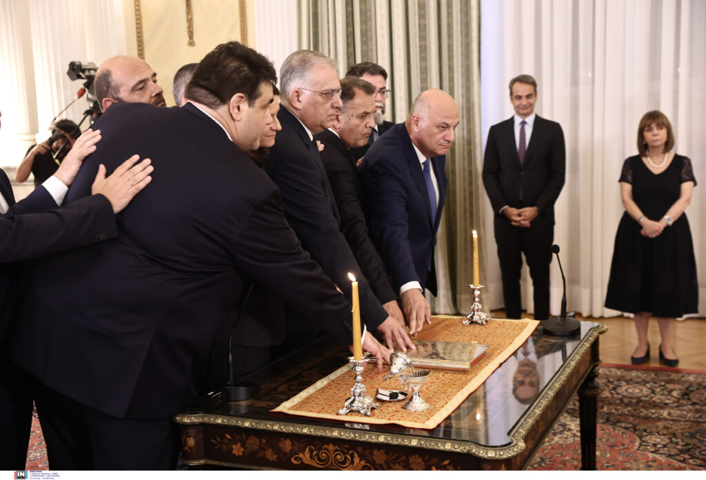 Ορκίστηκαν, από τον Αρχιγραμματέα της Ιεράς Συνόδου, αρχιμανδρίτη Ιωάννη Καραμούζη, παρουσία του πρωθυπουργού Κυριάκου Μητσοτάκη και της Προέδρου της Δημοκρατίας, Κατερίνας Σακελλαροπούλου, τα νέα μέλη της κυβέρνησης και συγκεκριμένα οι: