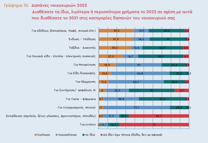 «Μαχαίρι στις καταναλωτικές δαπάνες, από τις εξόδους για διασκέδαση και φαγητό, τα ταξίδια μέχρι τις αγορές ρούχων και οικιακών ειδών αλλά και τις μετακινήσεις, έβαλαν οι Έλληνες καταναλωτές το 2022 λόγω των πληθωριστικών πιέσεων.