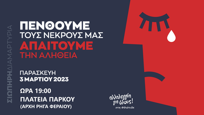 Στις 19:00’ επίσης υπάρχει το κάλεσμα από τη συλλογικότητα «Αλληλεγγύη για όλους στη Φθιώτιδα», με συγκέντρωση στην αρχή της Ρήγα Φεραίου στην πλατεία Πάρκου.