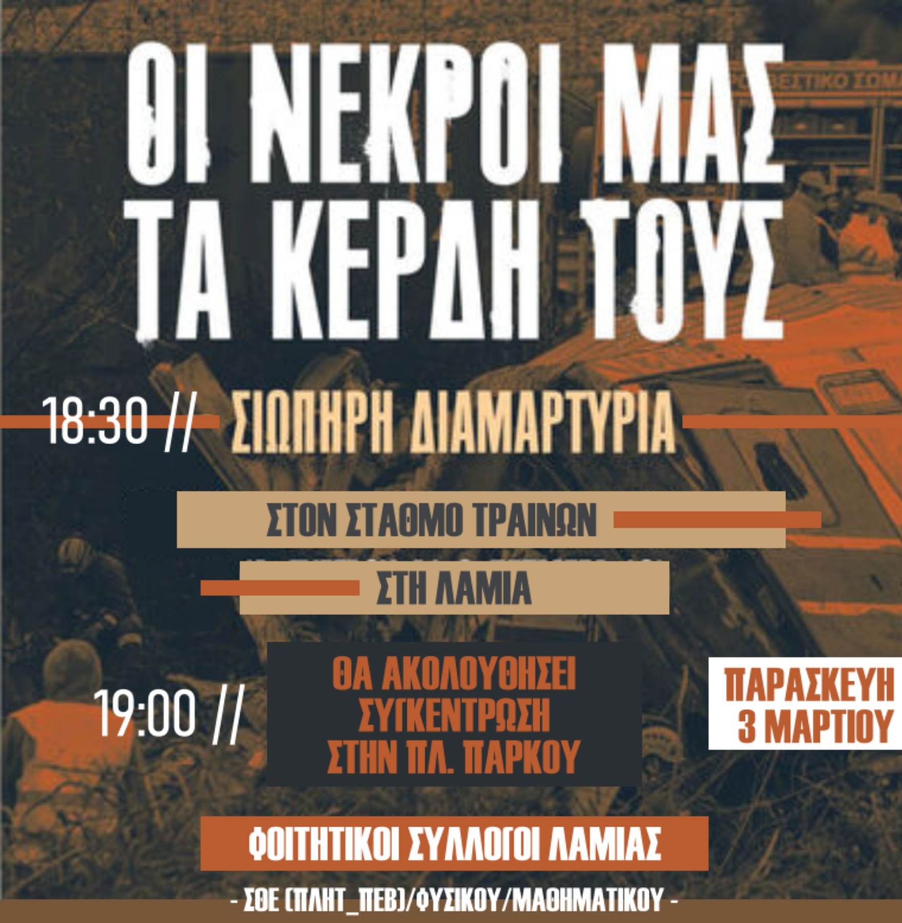 «Συμμετέχουμε στην σιωπηρή διαμαρτυρία (με κεριά) που θα πραγματοποιηθεί την Παρασκευή 3 Μαρτίου 2023 και ώρα 19:00 στην Πλατεία Πάρκου (αρχή της οδού Ρήγα Φεραίου) στη Λαμία», αναφέρουν στο κάλεσμά τους.
