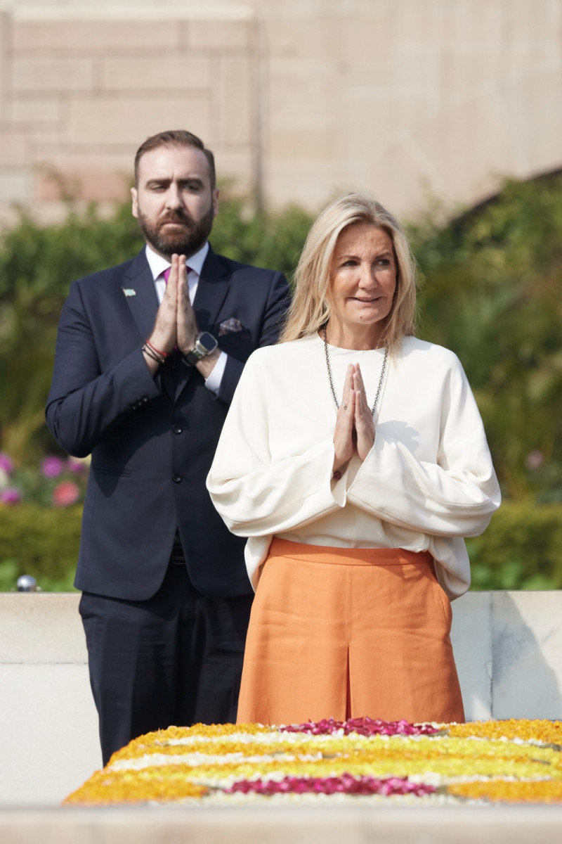 Ο πρωθυπουργός ήταν συνοδευόμενος από την σύζυγό του Μαρέβα, η οποία ήταν ντυμένη στα χρώματα της Ινδίας φορώντας μία λευκή μπλούζα σε φαρδιά γραμμή, πορτοκαλί παντελόνα και κρατώντας ένα πράσινο σκούρο φουλάρι.