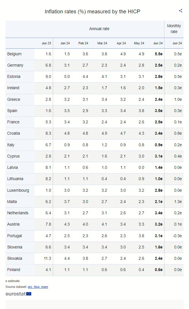 Τον Ιούνιο το υψηλότερο επίπεδο πληθωρισμού στην ευρωζώνη καταγράφουν το Βέλγιο (5,5%), η Ισπανία (3,5%) και η Κροατία και η Ολλανδία (και οι δυο 3,4%). Τα χαμηλότερα επίπεδα πληθωρισμού στην ευρωζώνη καταγράφουν η Φινλανδία (0,6%), η Ιταλία (0,9%) και η Λιθουανία (1%).