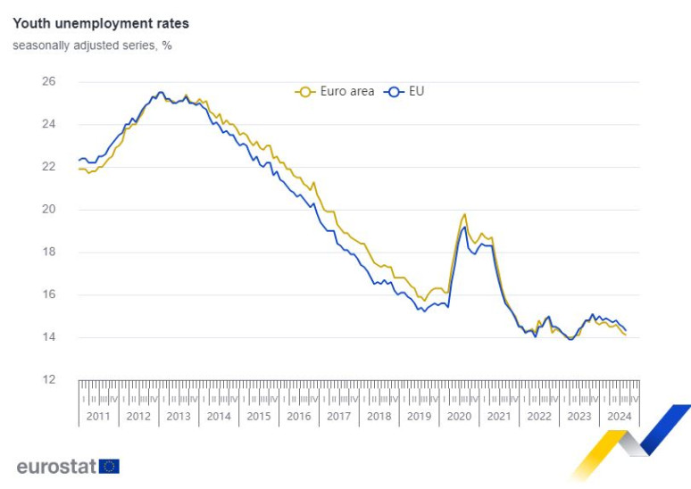 Τον Αύγουστο του 2024, το ποσοστό ανεργίας των νέων ήταν 14,3% στην ΕΕ, από 14,5% τον Ιούλιο του 2024 και 14,1% στη ζώνη του ευρώ, από 14,2% τον προηγούμενο μήνα.