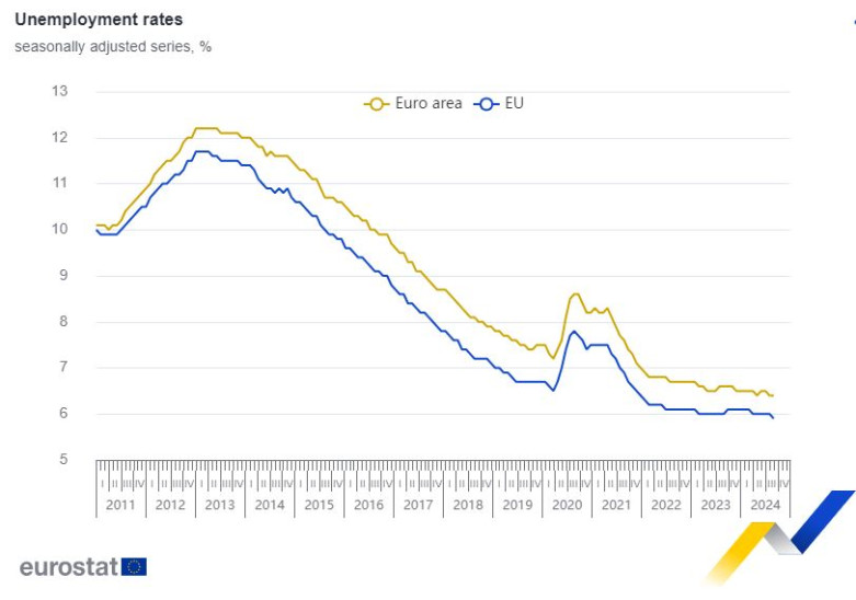 Τον Αύγουστο του 2024, το εποχικά προσαρμοσμένο ποσοστό ανεργίας στη ζώνη του ευρώ ήταν 6,4%, σταθερό σε σύγκριση με τον Ιούλιο του 2024 και μειώθηκε από 6,6% τον Αύγουστο του 2023. Το ποσοστό ανεργίας στην ΕΕ ήταν 5,9% τον Αύγουστο του 2024, από 6,0% τον Ιούλιο του 2024 επίσης όπως και τον Αύγουστο του 2023. Αυτά τα στοιχεία δημοσιεύονται από την Eurostat, τη στατιστική υπηρεσία της Ευρωπαϊκής Ένωσης.