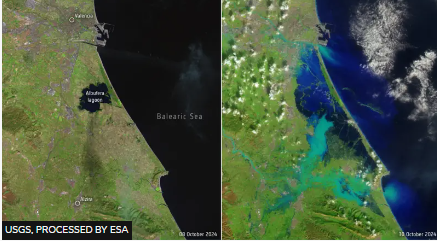 Δορυφορικές εικόνες που έδωσε στη δημοσιότητα ο Ευρωπαϊκός Οργανισμός Διαστήματος (ESA) δείχνουν την έκταση των επιπτώσεων της έντονης βροχόπτωσης και των ξαφνικών πλημμυρών στην περιοχή της Βαλένθια.