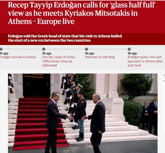 « Η πρώτη συνάντηση του Τούρκου προέδρου Ρετζέπ Ταγίπ Ερντογάν με την πρόεδρο Κατερίνα Σακελλαροπούλου φαίνεται να πήγε καλά. Ο Ερντογάν είπε στην κα. Σακελλαροπούλου ότι η επίσκεψή του στην Αθήνα χαιρετίζει την έναρξη μιας νέας εποχής μεταξύ των δύο χωρών», μεταδίδει το βρετανικό μέσο.
