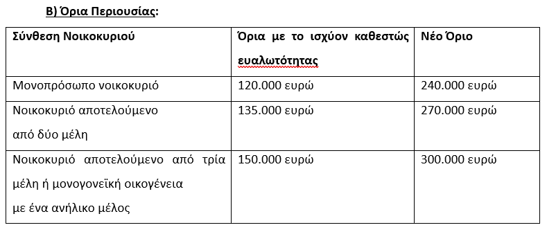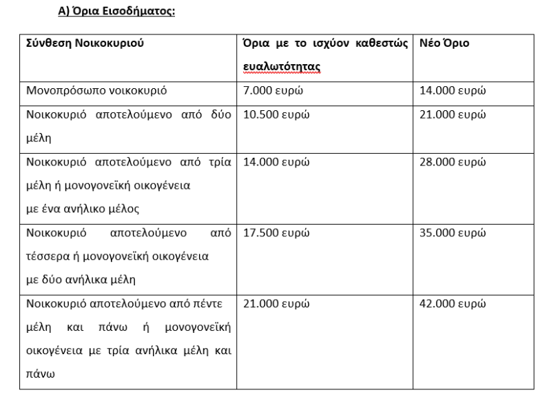 - Αύξηση των εισοδηματικών και περιουσιακών ορίων προκειμένου να χαρακτηριστεί ένας οφειλέτης ως επιλέξιμος στο πλαίσιο της υποχρεωτικής αποδοχής του εξωδικαστικού μηχανισμού από τους πιστωτές. Με τη ρύθμιση που εισάγεται, διπλασιάζονται τα κριτήρια για το χαρακτηρισμό δανειολήπτη ως επιλέξιμου προκειμένου να καταστεί υποχρεωτική η συναίνεση του συνόλου των πιστωτών για ένταξη του οφειλέτη στον εξωδικαστικό μηχανισμό. Ο διπλασιασμός των ορίων αυτών έχει ως προϋπόθεση ο οφειλέτης να έχει ανώτατο όριο ήδη μη εξυπηρετούμενων τραπεζικών οφειλών (δηλαδή σε τράπεζες ή servicers) τις 300.000 ευρώ.