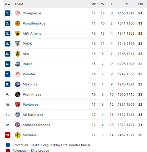 Χαμός γίνεται, επίσης, για τη μάχη της παραμονής, καθώς το Μαρούσι είναι τελευταίο με ρεκόρ 3-14, με Κολοσσό και Καρδίτσα να βρίσκονται πολύ κοντά με ρεκόρ 4-13. Αυτές οι τρεις ομάδες φαίνεται πως θα παλέψουν για να αποφύγουν τον υποβιβασμό.