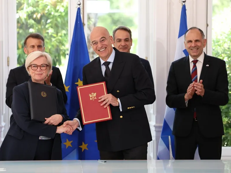 Μετά την ολοκλήρωση της συνάντησης, ο κ. Δένδιας μετέβη στο Μέγαρο Μαξίμου, όπου παρουσία των κκ Μητσοτάκη και Μακρόν, υπέγραψε μαζί με τον υπουργό Εξωτερικών Γιώργο Γεραπετρίτη, την κ. Βοτρέν και τον υπουργό παρά τω υπουργώ Ευρώπης και Εξωτερικών, αρμόδιο για θέματα Ευρώπης, της Γαλλικής Δημοκρατίας, Benjamin Haddad, την ανανέωση της συμφωνίας για τη Στρατηγική Εταιρική Σχέση για τη Συνεργασία στην Άμυνα και την Ασφάλεια μεταξύ της Ελλάδας και της Γαλλίας.